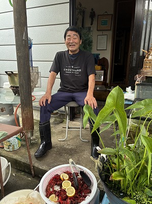 | 主宰する高橋孝憲さん | 近くの沼で捕ったザリガニ |