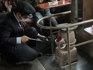 | 石炭を補充中 | スルメはアテンドが焼いてくれます | ストーブは2台あります |
