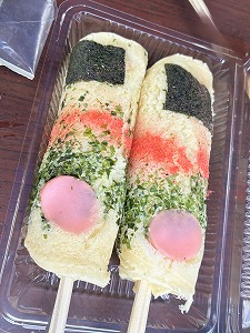 | 名物のホルモン揚げを購入 | 揚げ物の種類がすごい! | これがホルモン揚げ 中身はちくわ! |