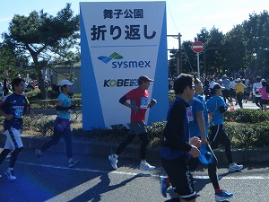 | 折り返しは17.6km地点 | 垂水の舞子公園はスッゴイ応援です! | 折り返すと道路いっぱいにランナーが! |