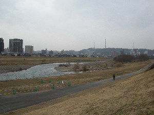| 川面に映るツインタワーマンション | 宮沢橋までの遊歩道 | 大年山をバックに宮沢橋 |
