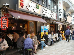 | 独特のうすい緑色をした蕎麦 | 浅草に移動、忍ばすの池 | 昼間から皆んな飲んでます! |