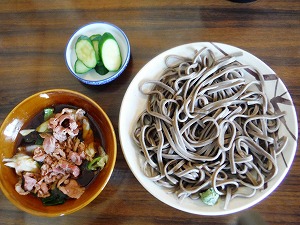 | ミニ冷たい肉そばセット(1000円) | セットには揚げそばがきも付きます | 細打ちと太打ちの食べ比べ(1000円) |