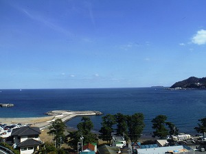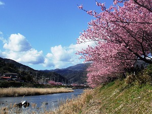 | 海岸線を走ります♪ | 右に見える島が伊豆大島 | 河津駅の桜も満開 |