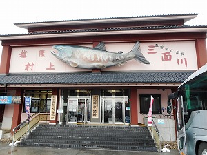 | 村上名物「塩引鮭」 | JRのポスターにもなってます♪ | 「湯田上温泉」は越後平野を一望できます! |