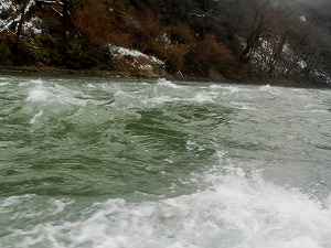 | ユーモアたっぷりの船頭さん | この辺は流れが急です! | 雪景色がまたいいですね♪ |