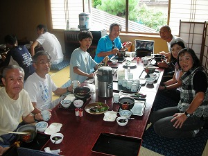 | オーナー夫婦と一緒に | 集合写真、14人と1匹 | 山形一寸亭で早めの昼食 |
