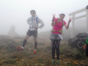 | お釜の入口付近が折り返し地点 | 折り返しに向かう選手とすれ違う | 熊野岳山頂で |