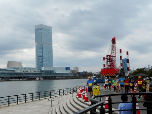| 折り返して後方の選手を確認 | 仮装したブラスバンド | 新潟のランドマーク 朱鷺メッセ |