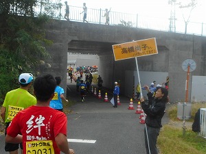 | 万代太鼓 若藤会 | 24.8キロ地点の給水所 暑い! | 次は右の橋を渡ります |