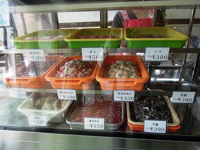 | 開店の15時30分に一番のりしました! | 左からレバー、ハツ、ホルモン |