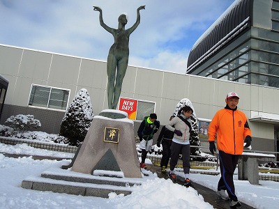 | 蔵王連峰をバックに雪道ラン | ついに阿武隈川河口、太平洋に着きました! |