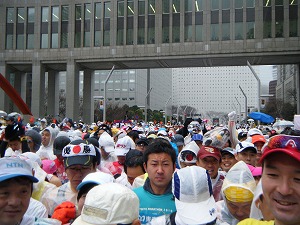 | 翌日は冷たい雨、スタート地点の東京都庁 | 雨なので皆、雨具を着用してます | ここから後方に3万人のランナーがいます! |