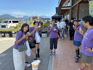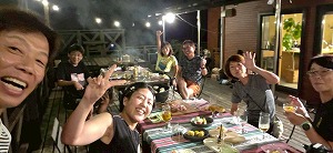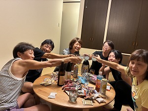 | 二次会は部屋で夜遅くまで(>_<) | 朝食は和食 | ロビーで記念撮影 |