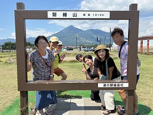 | 南ヶ丘牧場へ 磐梯山の頂上に雲が | Masamichiさん、撮影準備中 | ギャルピース? |