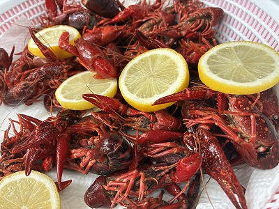 | 茹でたザリガニを試食 |