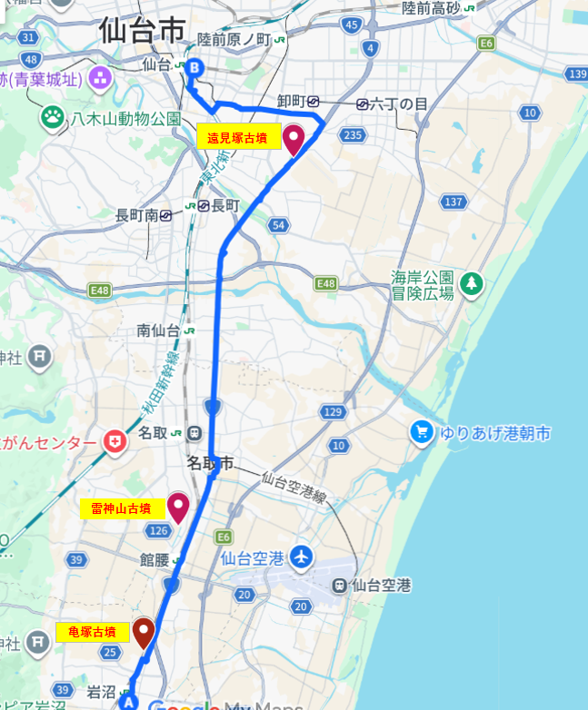自宅~長町駅~岩沼駅~亀塚古墳~雷神山古墳~遠見塚古墳~自宅