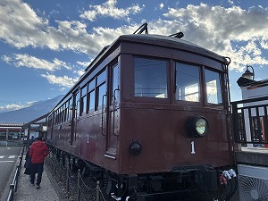 | 河口湖駅はインバウンドだらけ | 昔の富士急車両 | ホームから見た富士山 |