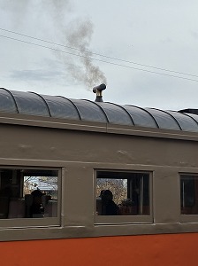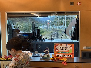 | 2号車 最後尾で記念撮影 | 運転席からの風景がモニターで | オランダせんべいをつまみに |