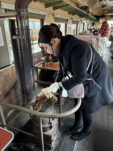 | 石炭を補充中 | スルメはアテンドが焼いてくれます | ストーブは2台あります |
