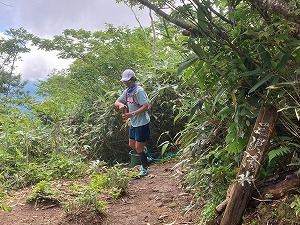 苦労して稜線に出ると朝日連峰の山並みに大感激♪ 今回はトレランスタイルで