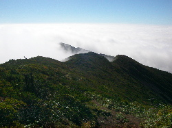 刈田岳からはハイラインを横切りながら刈田峠へと向かう。刈田峠からは登山道となり、前山、櫛が峰を越えると突然、広大な池塘の点在する芝草平に着く。チングルマやキンコウカなどの花の季節に来てみたい。ここからまた登ると1等三角点の標高1817mの屏風岳だ。ここでおにぎりを食べて小休止をするが、近くで雲が沸き立ち空は日本晴れ、まさに雲上の楽園だった。ここから南屏風、不忘山へ向かう稜線は東側が鋭く切れ落ちた、まさにナイフエッジだ。以前、初めて後烏帽子岳に登った時に見た屏風岳の絶壁は圧巻だった。しかし今回はオホーツク海高気圧のため、太平洋側は厚い雲に覆われて全く見えなかった。